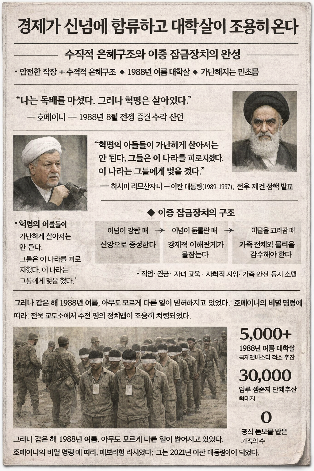 이 한 마디가 수백만 명을 경악시켰다. 그러나 이것은 쇼가 아니었다. 그에게 이란은 조국이 아니라 신의 전쟁터였다. 감정적 애착이 개입할 자리가 없었다. 바로 그 냉혹함이 — 이후 수십 년의 냉혹함을 예고했다.
