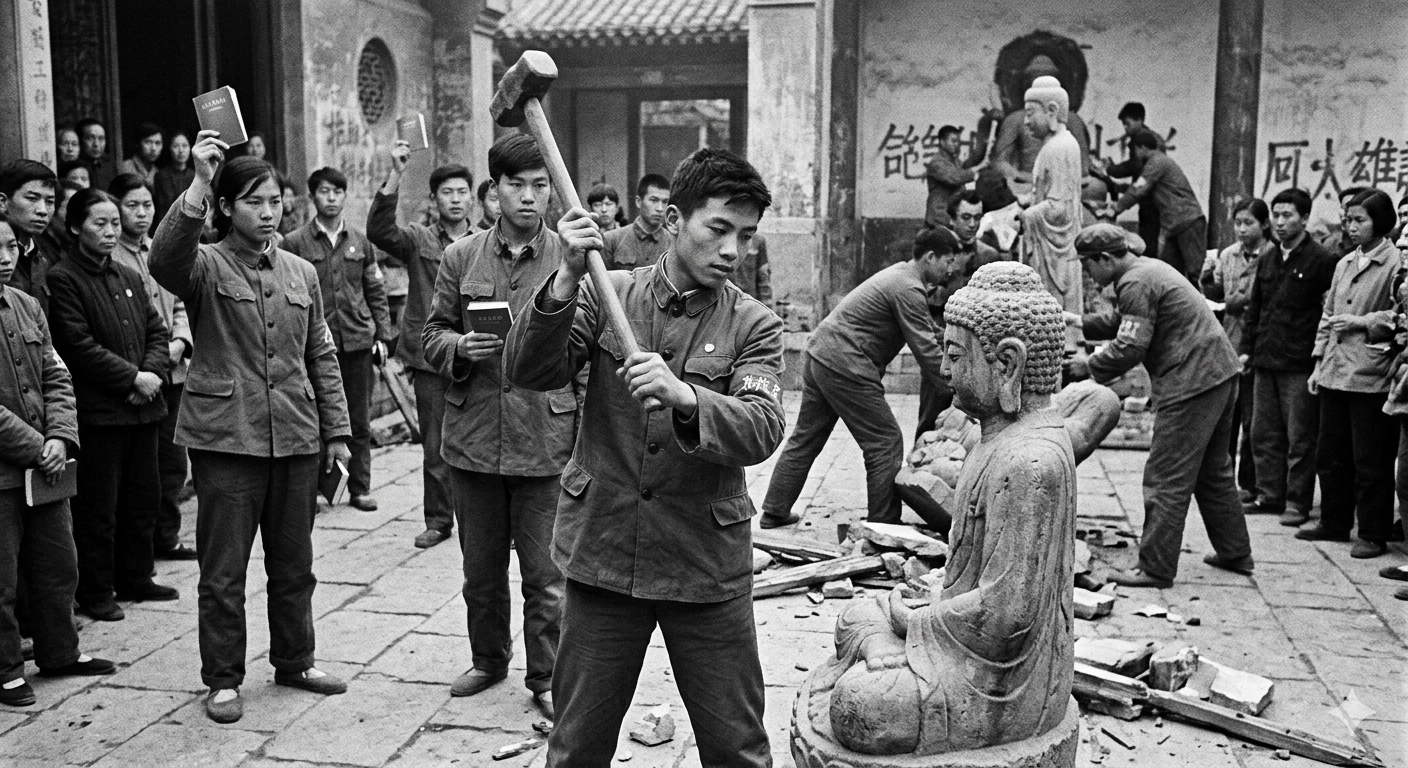 홍위병(紅衛兵)들이 사원을 부수고 불상을 깨뜨렸다. 성경, 불경, 도덕경이 불태워졌다. 성직자들이 끌려나와 공개 비판 집회(批鬥會)에서 굴욕을 당했다. '파사구(破四舊, 낡은 사상·문화·풍속·습관을 타파하라)'의 이름으로 중국 5,000년의 정신적 유산이 10년 만에 대규모로 파괴되었다.