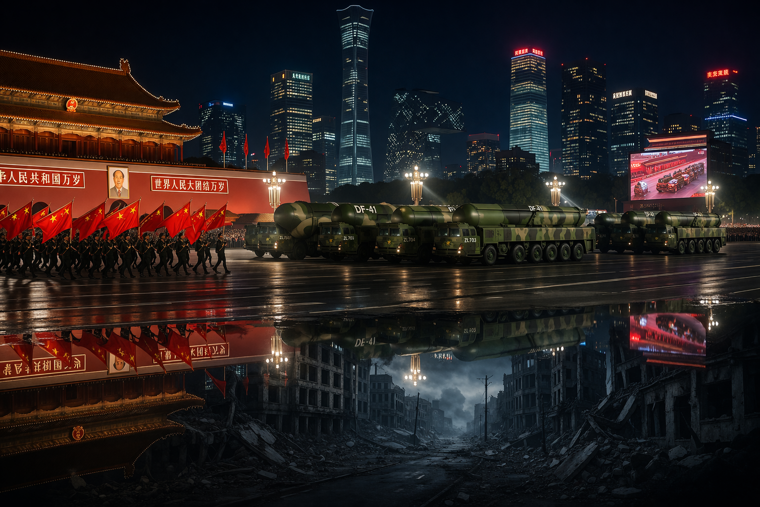 '종이 호랑이'라는 말을 처음 만든 것은 역설적으로 마오쩌둥이었다. 1956년 그는 미국을 가리켜 '종이 호랑이'라 했다. '겉으로는 무섭지만 실제로는 약하다'는 뜻이었다. 2026년, 역사는 그 표현을 돌려보내고 있다. 겉으로는 열병식의 DF-41 미사일이 하늘을 가르고, 호르무즈에서 위안화 통행증이 나부끼지만—속에는 물이 든 연료탱크와 숙청된 지휘관들만 남아 있다.